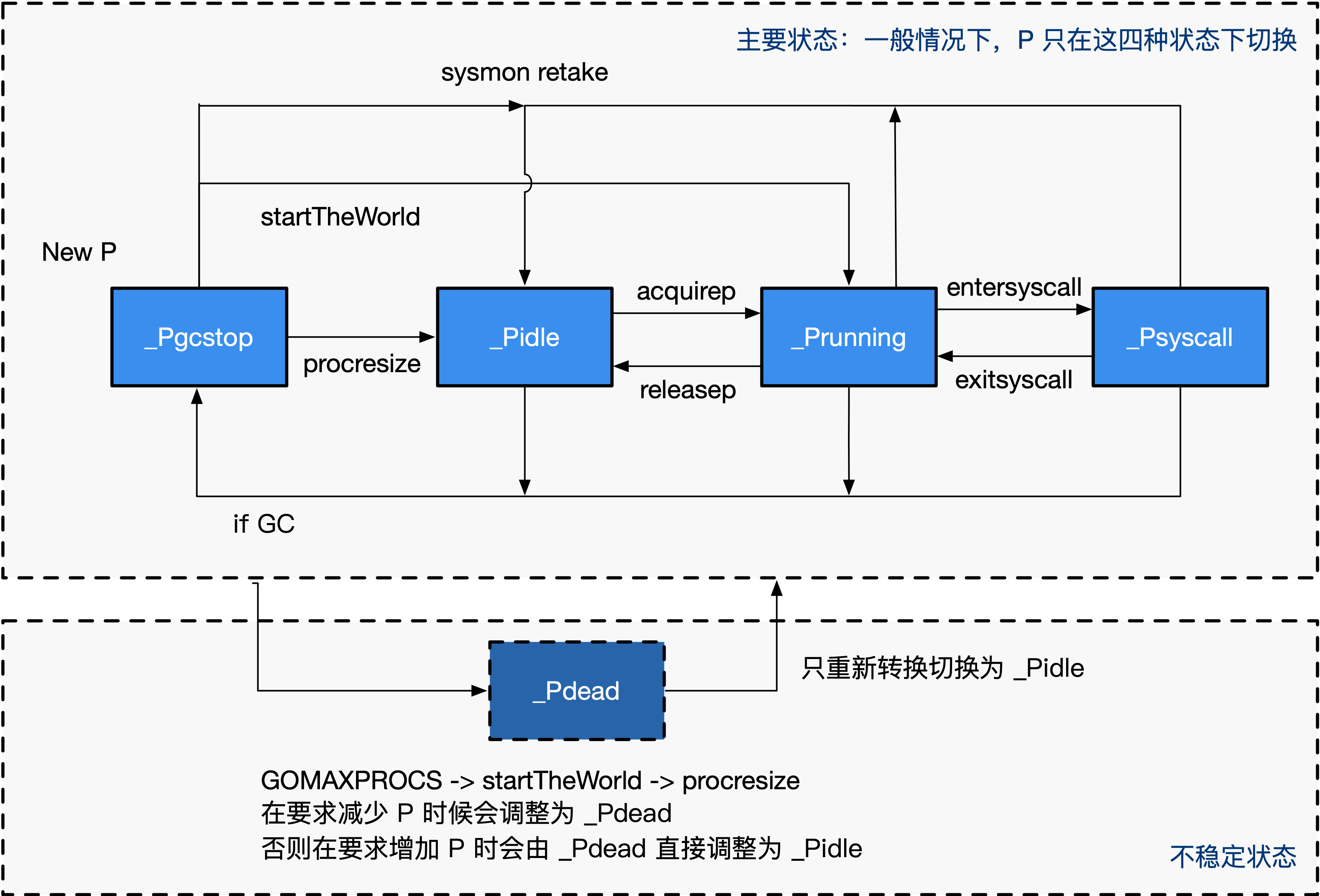_Prunning:表示 P正在被 M 持有运行用户代码或者调度器。只有当 M 持有 P 时,它的状态才被允许修改到 _Prunning。如果没有活干,那么P将切换到 _Pidle 状态;当进行系统调用的时候会切换到 _Psyscall;GC 期间会切换到 _Pgcstop;M 也可以将 P 的所有权直接交给另一个 M(例如,调度到锁定的 G);