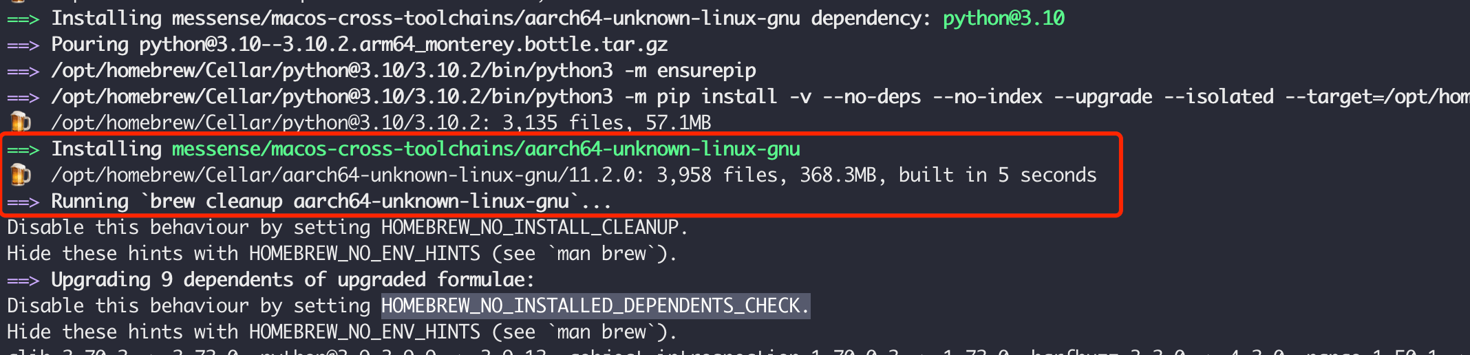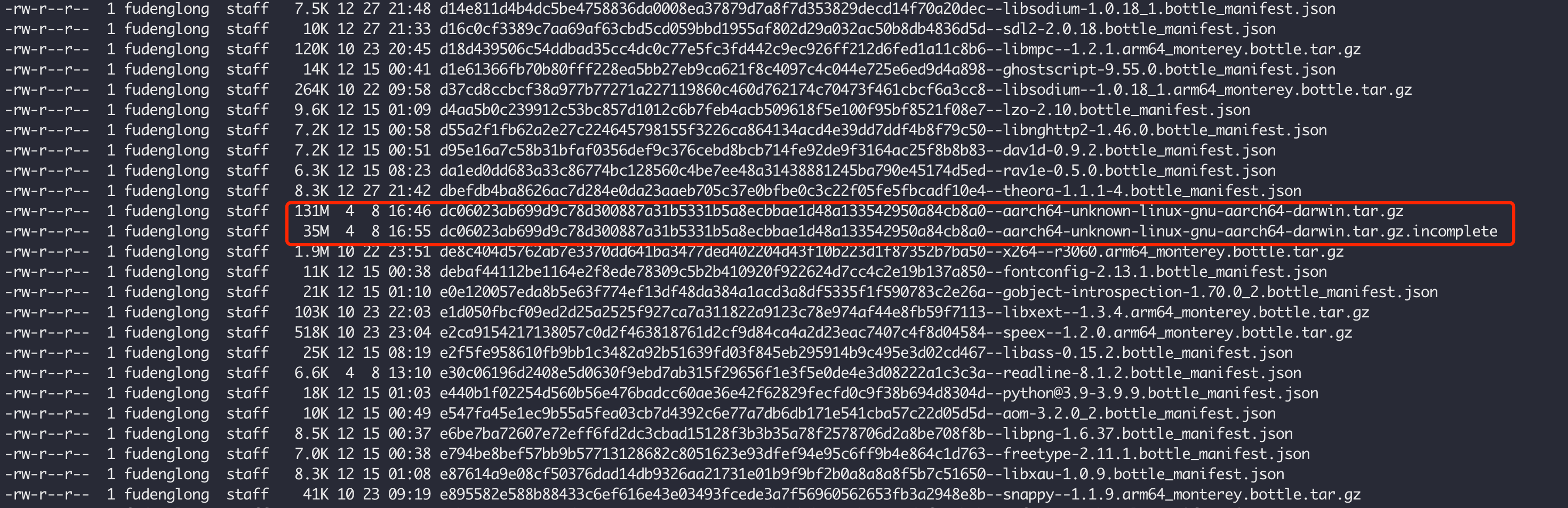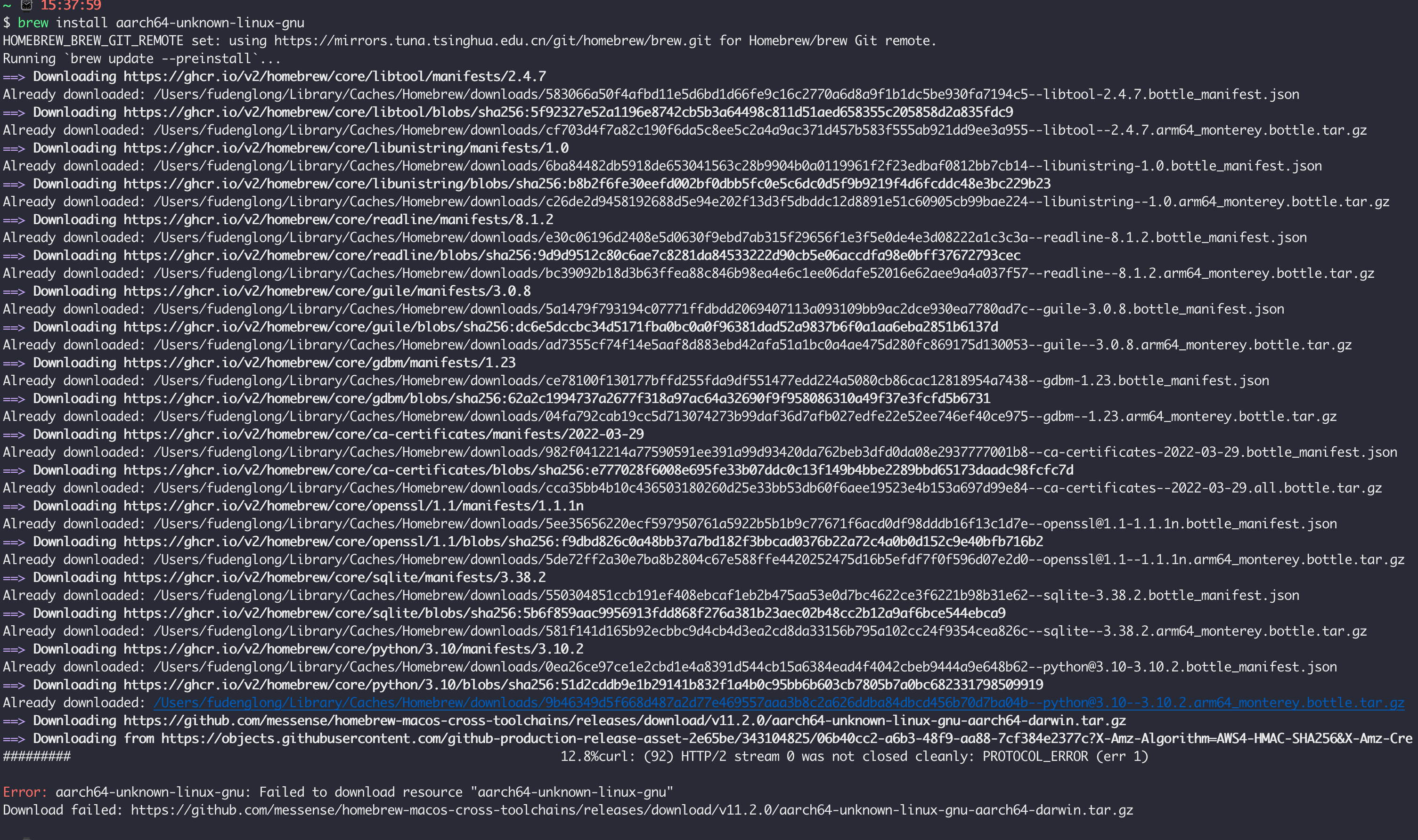 然后重新执行命令 brew install aarch64-unknown-linux-gnu,它会从断点处重传,看到已经下载完成了,就不会再下载了。