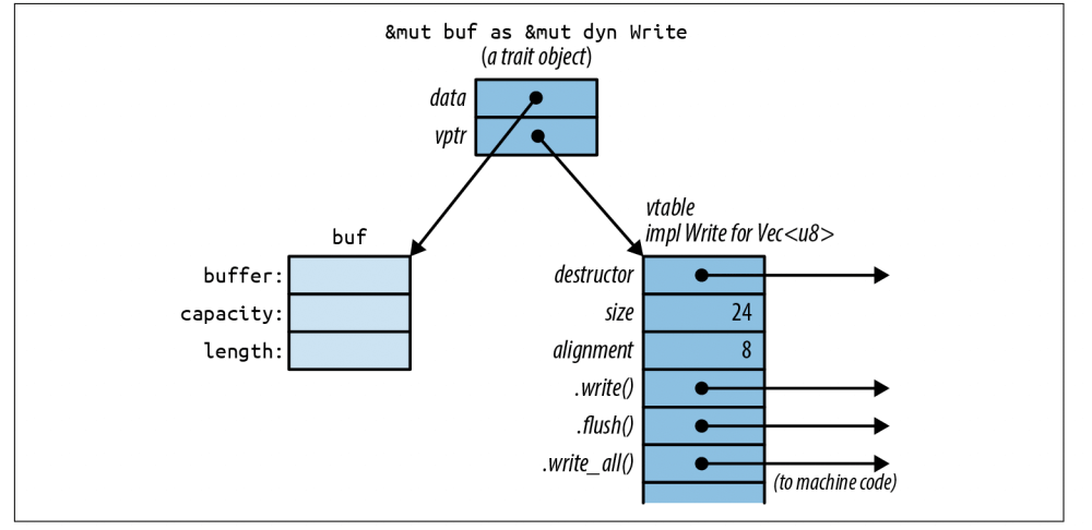 Trait 类型的引用,如 writer,称为 Trait 对象。 Trait 对象指向某个值,它有生命周期,可以是可变引用或共享引用。Trait 对象的不同之处在于,它包含了一些关于所指对象类型的额外信息,当你调用 writer.write(data) 时,Rust 需要根据 *writer 的类型动态调用正确的 write 方法。Rust 不允许直接查询类型信息,也不支持从 Trait 对象向下转换,&mut dyn 不能转换为 Vec<u8> 这样的具体类型。