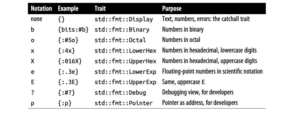 格式化宏实际上是 std::fmt 中定义的一系列宏,可以通过自己实现这些特征中的一个或多个来使 Rust 的格式化宏格式化自己的类型。