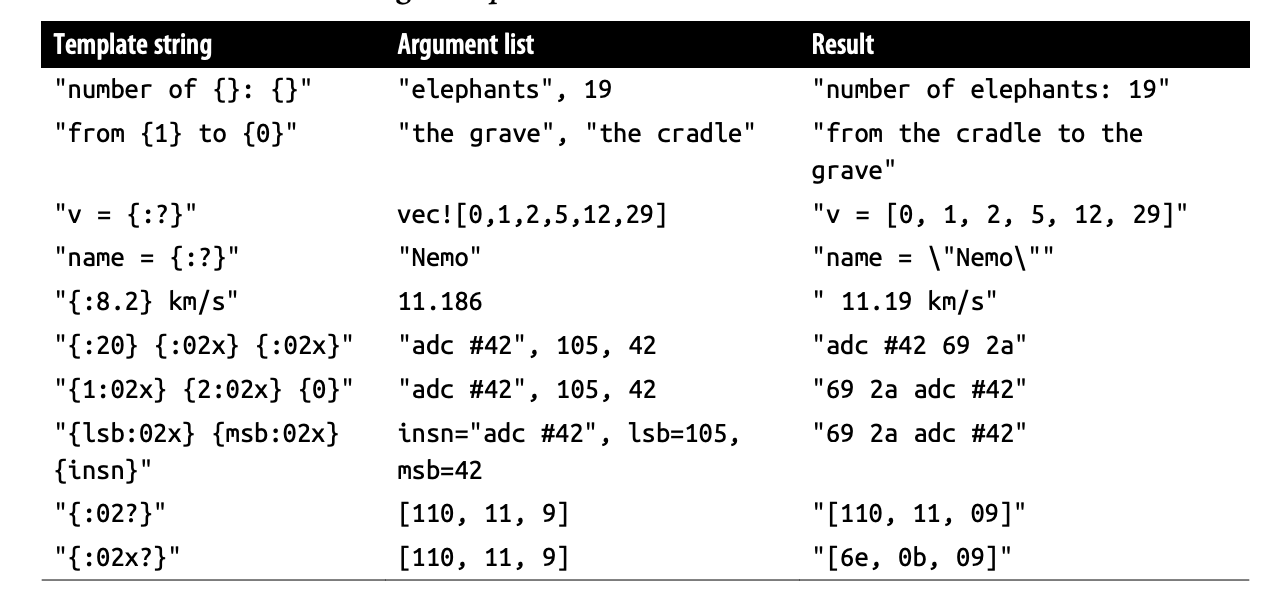 在编译时,format_args! 宏解析模板字符串并根据参数类型检查它,如果有任何问题则报告错误。在运行时,它计算参数值并构建一个 Arguments ,其中包含格式化文本所需的所有信息:模板的预解析形式,以及对参数值的共享引用。