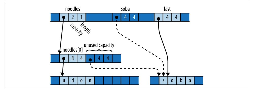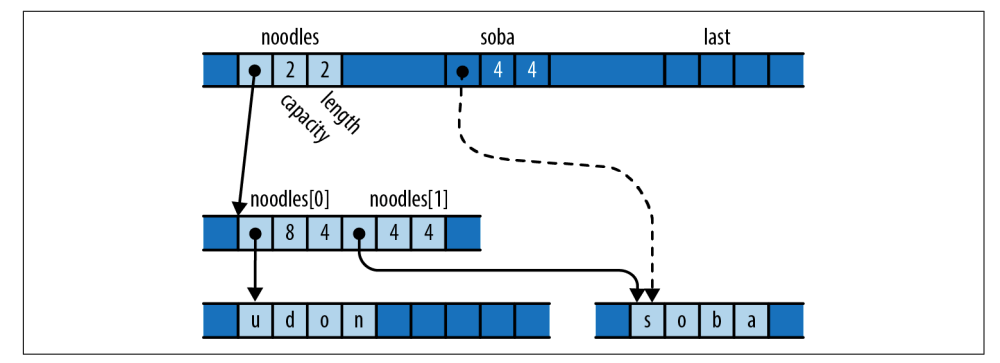 该 vector 已初始化其空白空间以拥有该字符串并增加其长度以将其标记为新的活动元素。 vector 现在是字符串的所有者;可以引用它的第二个元素,删除 vector 会释放两个字符串, soba 现在未初始化。