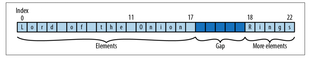 Emacs 文本编辑器使用一种称为间隙缓冲区的简单数据结构,可以在恒定时间内插入和删除字符。 String 将其所有备用容量保留在文本的末尾,这使得 push 和 pop 比较轻量,而间隙缓冲区将其备用容量保留在文本中间,即进行编辑的位置,这种备用能力称为缺口。在间隙插入或删除元素很轻量:只需根据需要缩小或扩大间隙。可以通过将文本从间隙的一侧移动到另一侧来将间隙移动到喜欢的任何位置。当间隙为空时,将迁移到更大的缓冲区。