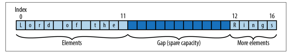 与 Vec 使用 std::ptr::write 进行 push 和 std::ptr::read 进行 pop 的方式类似, GapBuffer 使用 write 插入和 read 删除。 就像 Vec 必须调整它的长度以保持初始化元素和备用容量之间的边界一样, GapBuffer 也会调整它的间隙。