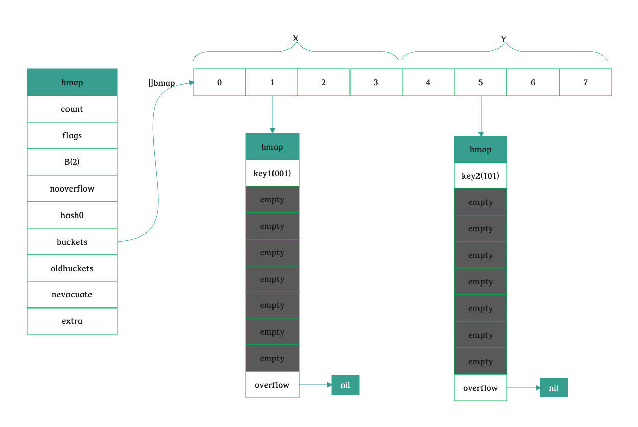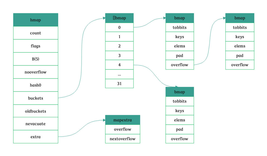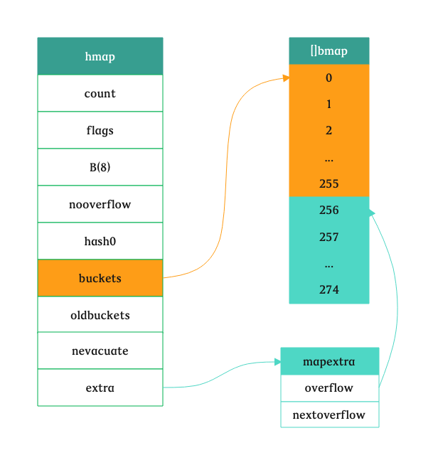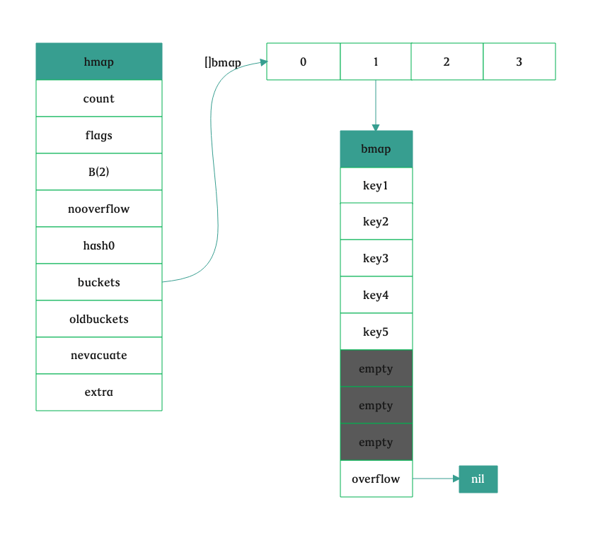 if base != nbuckets { // We preallocated some overflow buckets. // To keep the overhead of tracking these overflow buckets to a minimum, // we use the convention that if a preallocated overflow bucket's overflow // pointer is nil, then there are more available by bumping the pointer. // We need a safe non-nil pointer for the last overflow bucket; just use buckets. // 计算出第一个溢出桶的位置和最后一个溢出桶的位置 nextOverflow = (*bmap)(add(buckets, base*uintptr(t.bucketsize))) last := (*bmap)(add(buckets, (nbuckets-1)*uintptr(t.bucketsize))) last.setoverflow(t, (*bmap)(buckets)) } return buckets, nextOverflow }