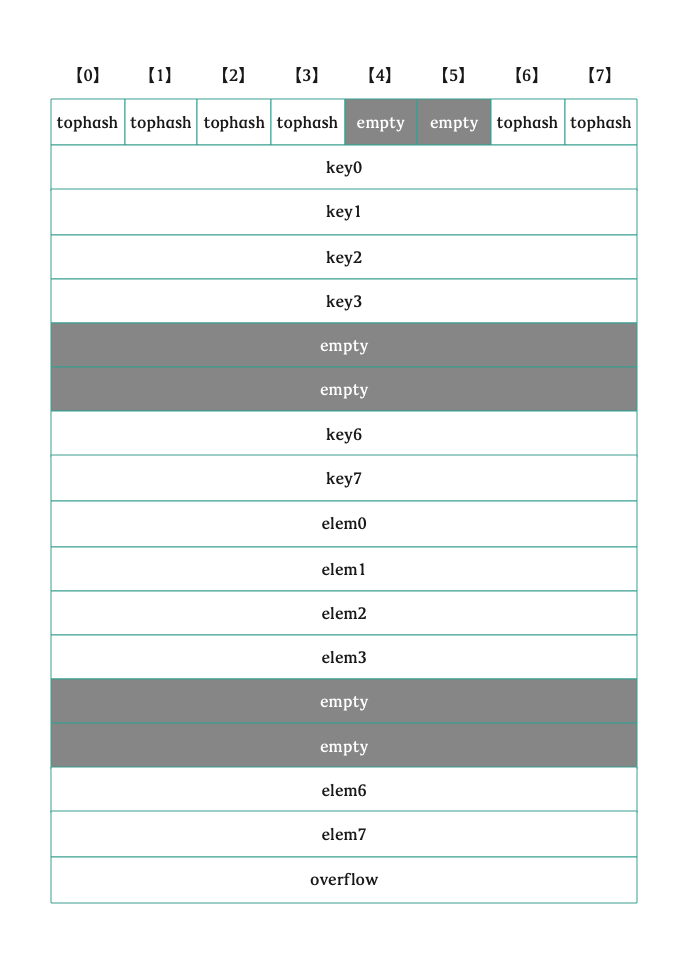 type bmap struct { // tophash generally contains the top byte of the hash value // for each key in this bucket. If tophash[0] < minTopHash, // tophash[0] is a bucket evacuation state instead. tophash [bucketCnt]uint8 // Followed by bucketCnt keys and then bucketCnt elems. // NOTE: packing all the keys together and then all the elems together makes the // code a bit more complicated than alternating key/elem/key/elem/... but it allows // us to eliminate padding which would be needed for, e.g., map[int64]int8. // Followed by an overflow pointer. }