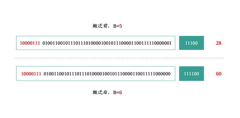 // 假设 b = 8,map 的类型为 map[string]int funcmakeBucketArray(t *maptype, b uint8, dirtyalloc unsafe.Pointer) (buckets unsafe.Pointer, nextOverflow *bmap) { base := bucketShift(b) // 那么 base = 256 nbuckets := base // nbuckets 此时为 256 if b >= 4 { // 计算溢出桶的数量 nbuckets += bucketShift(b - 4) // nbuckets += (1 << (b - 4)) 值为 272 sz := t.bucket.size * nbuckets // t.bucket.size 为 208,sz = 56576 up := roundupsize(sz) // roundupsize 根据 sz 计算需要 56576 字节的内存时,mallocgc 需要申请 57344 字节 if up != sz { nbuckets = up / t.bucket.size // 根据需要申请的内存数量重新计算 nbuckets,将内存最大化利用,这里为:275 } }