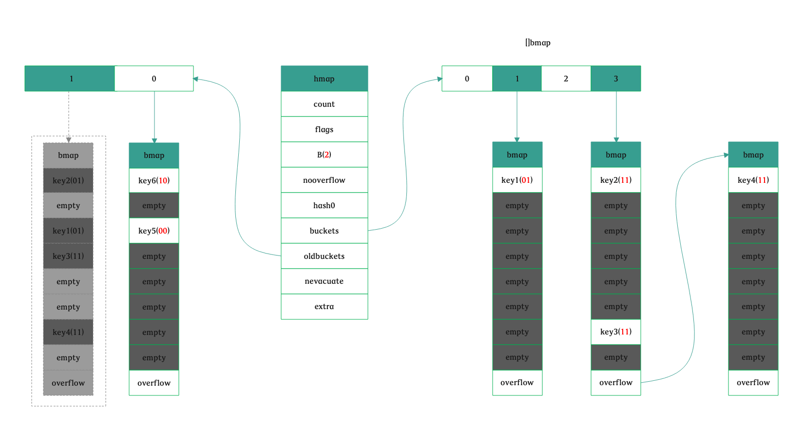 这个时候看到的正常桶和溢出桶应该如下图所示,它们是连接在一起的: