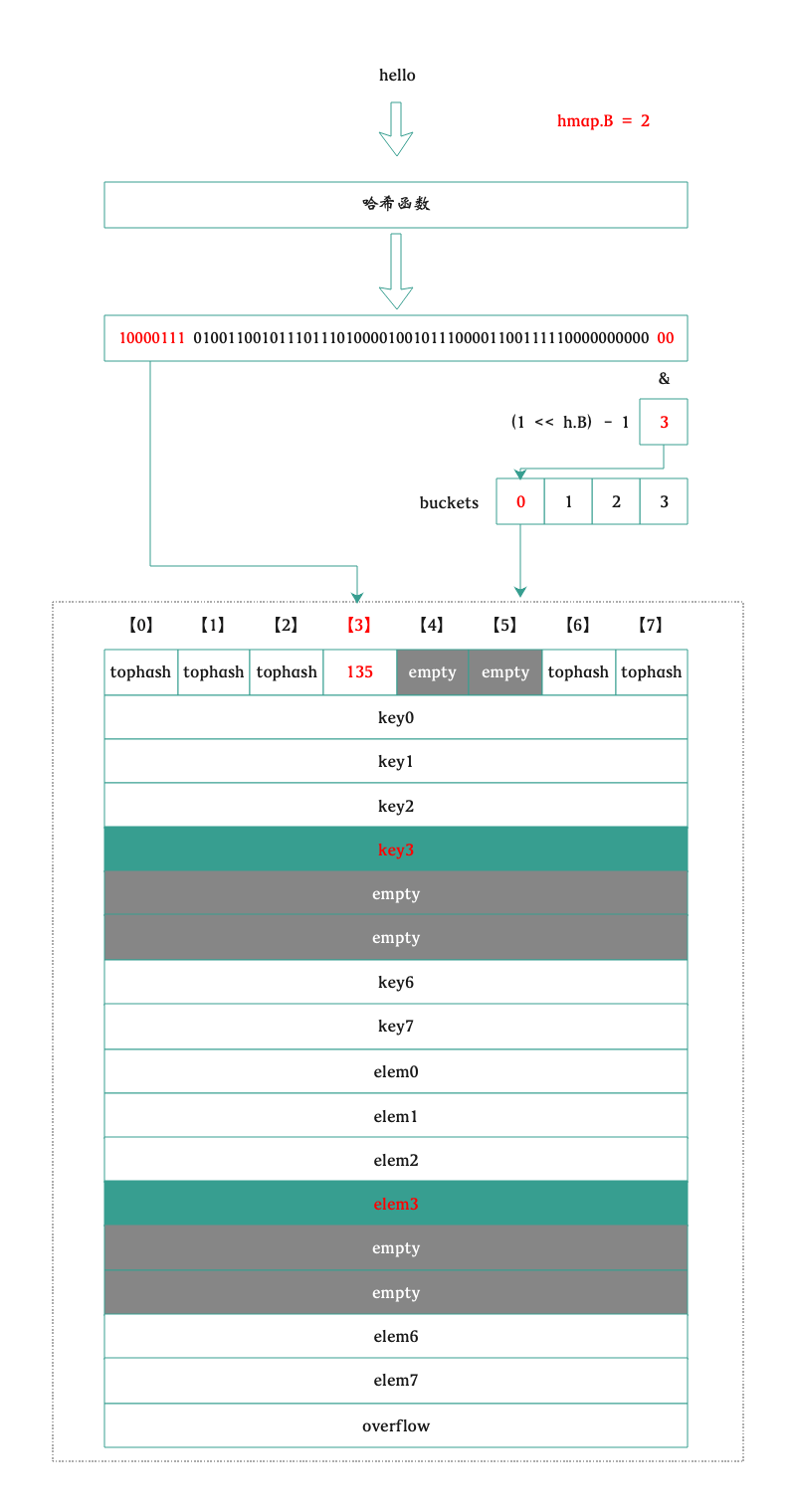 // 获取 bucket 编号,如果处于扩容过程中,那么就进行扩容 bucket := hash & bucketMask(h.B) if h.growing() { growWork(t, h, bucket) } b := (*bmap)(add(h.buckets, bucket*uintptr(t.bucketsize))) bOrig := b top := tophash(hash) search: // 遍历所有的溢出桶 for ; b != nil; b = b.overflow(t) { for i := uintptr(0); i < bucketCnt; i++ { // 如果这个bucket当前槽及其后面都是空的,直接退出 if b.tophash[i] != top { if b.tophash[i] == emptyRest { break search } continue }