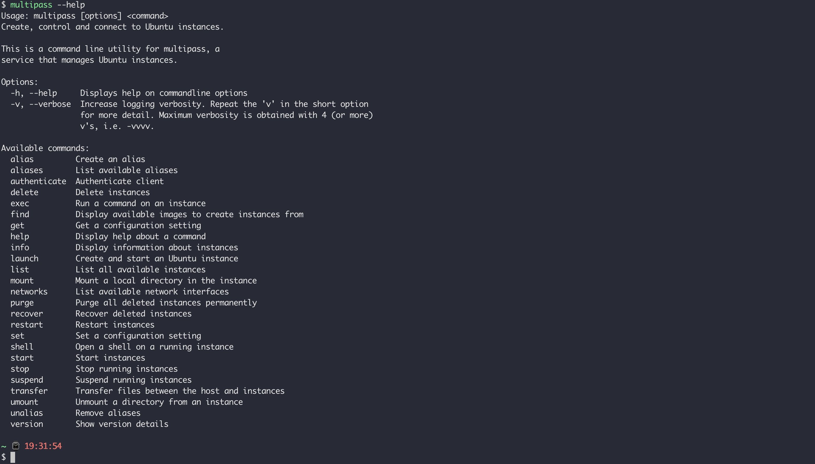 下载安装之后,本地会有一个 multipass 命令,后续所有的操作都是基于此命令,例如,查看本地帮助: