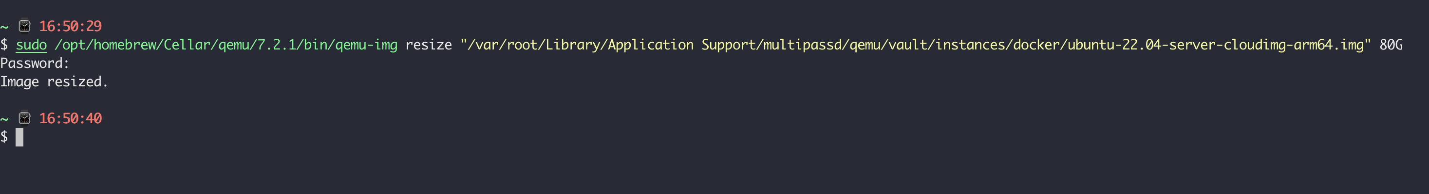 虚拟机的磁盘大小在创建的时候就固定了,目前 multipass 没有提供扩容虚拟机磁盘的直接命令,但是总有大神会给出方案,例如这里的:https://github.com/canonical/multipass/issues/62#issuecomment-1093179387 。