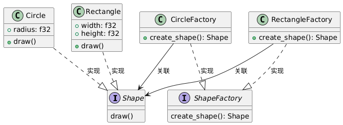 1 2 3 4 5 6 7 8 9 10 11 12 13 14 15 16 17 18 19 20 21 22 23 24 25 26 27 28 29 30 31 32 33 34 35 36 37 38 39 40 41 42 43 44 45 46 47 48 49 50 51 52 53 54 55 56 57 58 59 60 61 62 trait Shape { fn draw (&self) ; } struct Circle { radius: f64, } impl Shape for Circle { fn draw (&self) { println!("绘制一个半径为{}的圆形" , self.radius); } } struct Rectangle { width: f64, height: f64, } impl Shape for Rectangle { fn draw (&self) { println!("绘制一个宽为{},高为{}的矩形" , self.width, self.height); } } trait ShapeFactory { fn create_shape (&self) -> Box<dyn Shape>; } struct CircleFactory; impl ShapeFactory for CircleFactory { fn create_shape (&self) -> Box<dyn Shape> { Box::new (Circle { radius: 5.0 }) } } struct RectangleFactory; impl ShapeFactory for RectangleFactory { fn create_shape (&self) -> Box<dyn Shape> { Box::new (Rectangle { width: 4.0 , height: 6.0 }) } } fn main () { let circle_factory = CircleFactory; let circle_shape = circle_factory.create_shape(); circle_shape.draw(); let rectangle_factory = RectangleFactory; let rectangle_shape = rectangle_factory.create_shape(); rectangle_shape.draw(); }